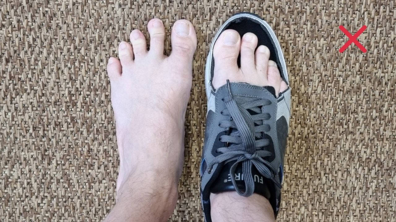 ❌ Kenkä on leveä päkiän kohdalta, mutta kaventuu siitä eteenpäin - varpaat eivät mahdu leviämään.